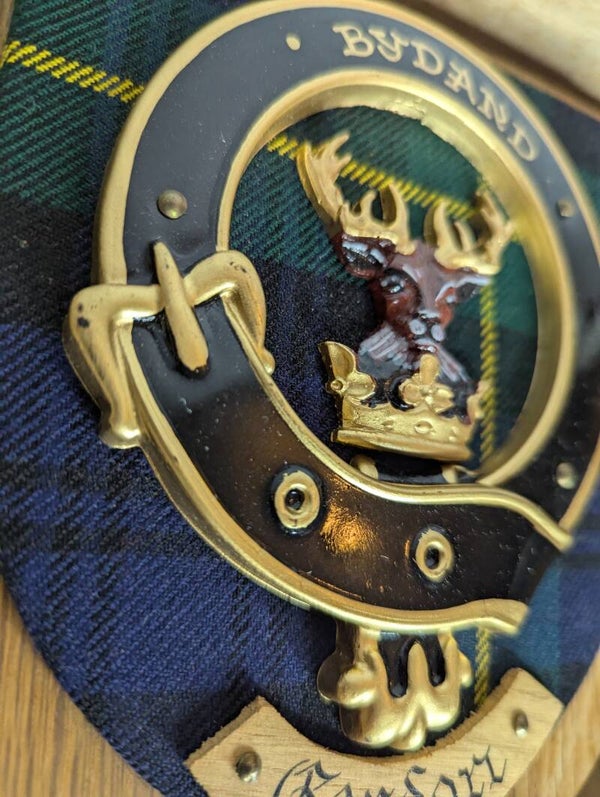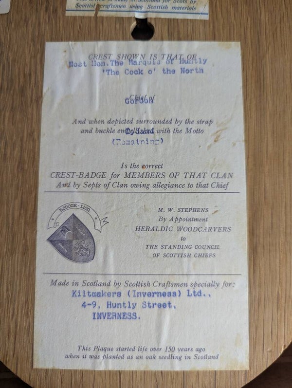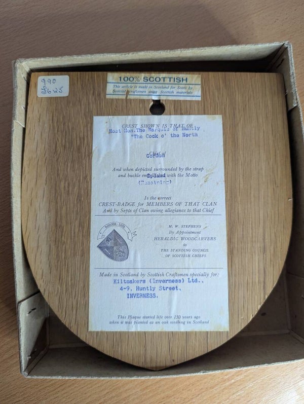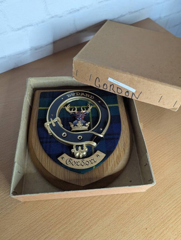 CLAN GORDON Wapenschild Wapenschild van een gesneden houten tablet met het motto: Bydand (overgebleven). Gemaakt in Schotland. Met certificaat en doosje.